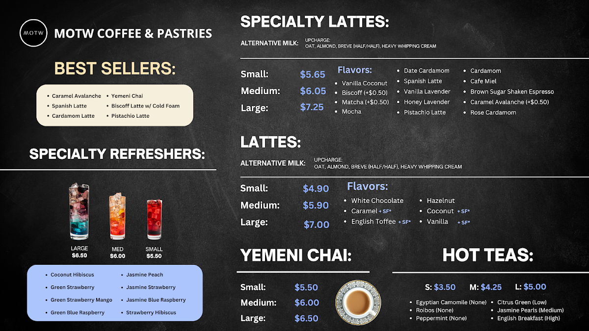 Welcome to MOTW Coffee and Pastries Naperville, a hidden gem tucked away at 4931 Illinois Rte 59. This cozy café combines modern aesthetics with rich cultural influences, creating a welcoming atmosphere for all. Renowned for its extensive menu offering a blend of unique beverages and delightful pastries, MOTW proudly stands for “Muslims of the World,” emphasizing community and connection.